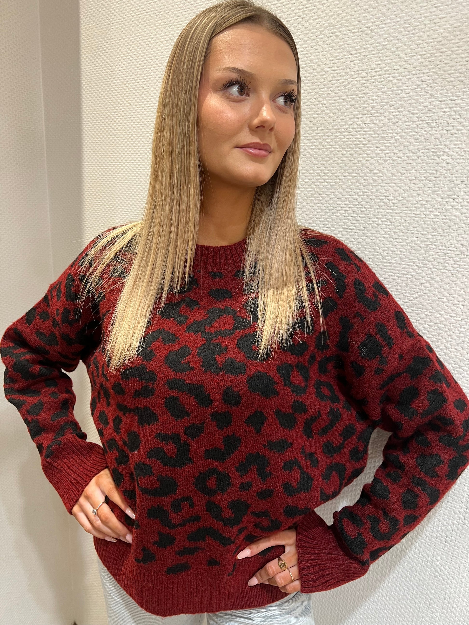 pull imprimé léopard de couleur rouge et noire, coupe droite légèrement ample