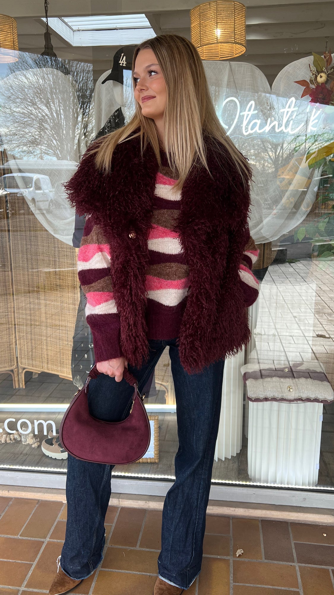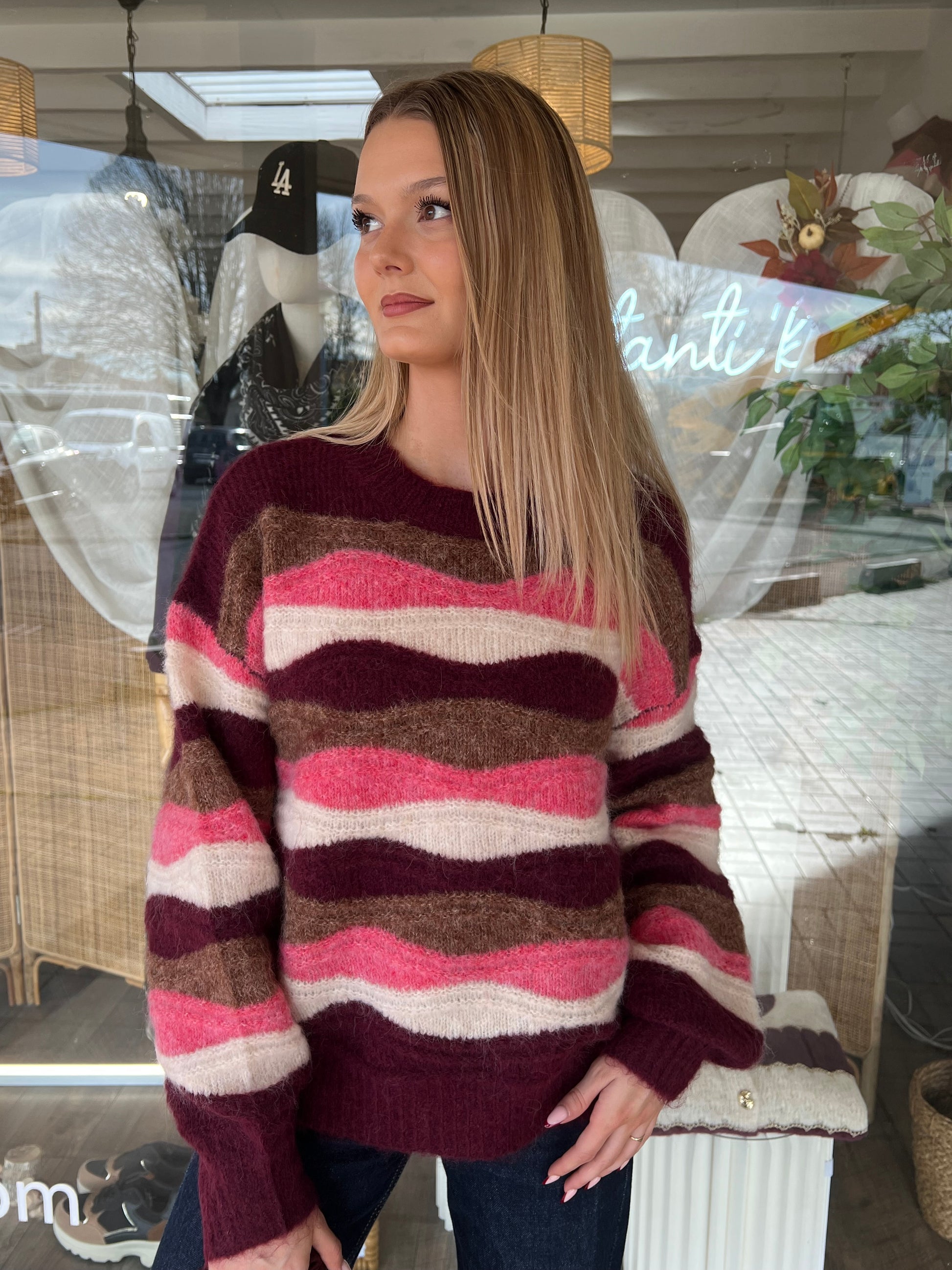 Pull a rayures bordeaux , rose , blanches et camel