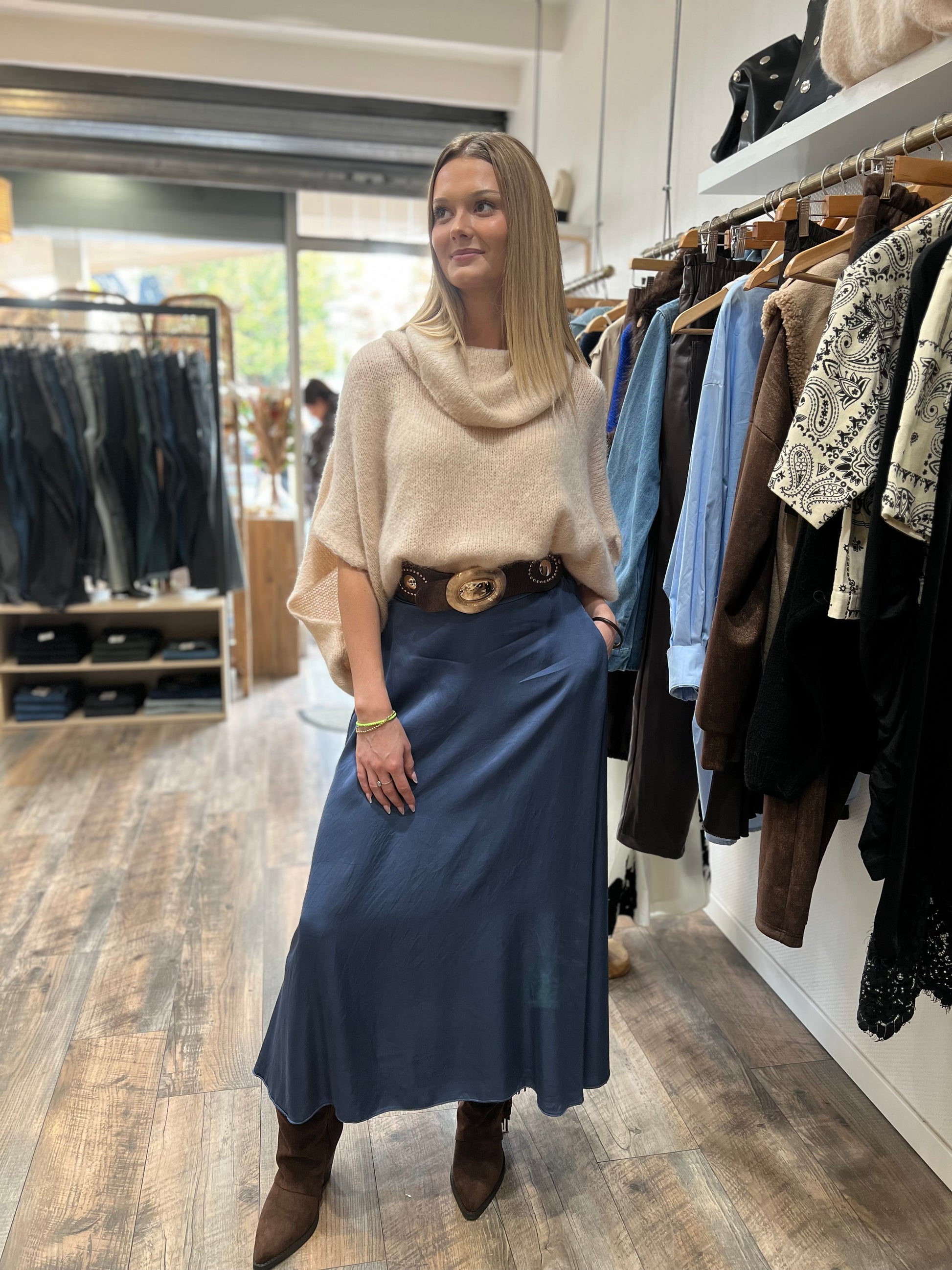 jupe longue satinée , poches sur les cotés , coupe ample , taille élastique à l'arrière dos